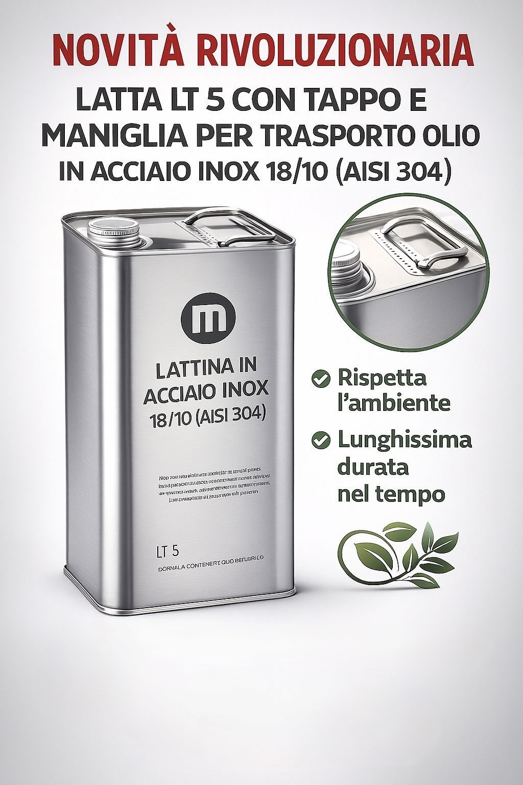 Novità Latta Lattina per Olio da lt. 5 in ACCIAIO INOX 18/10 cn Tappo e Maniglia