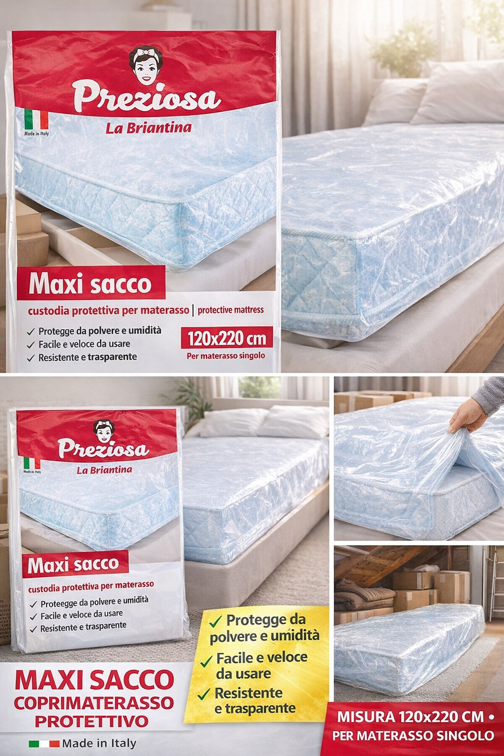 Maxi sacco trasparente, profumato alla lavanda per materasso singolo. Formato 120x220 cm. Protegge il materasso non utilizzato da umidità, polvere, acari, tarme e macchie. Confezione da 1 pz. Prodotto fabbricato in italia.
