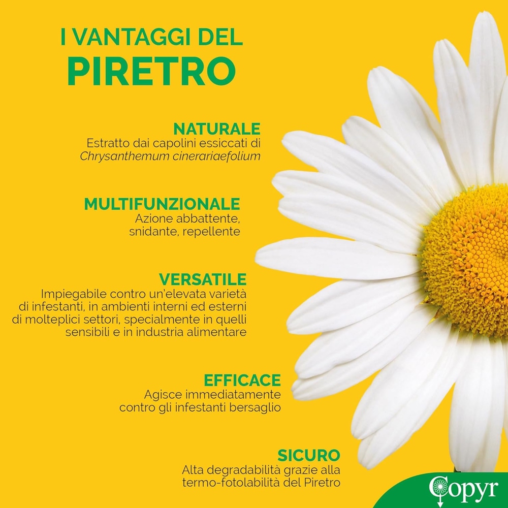 Azione repellente: il piretro non solo elimina gli insetti, ma ne impedisce anche la reinfestazione, creando una barriera protettiva.