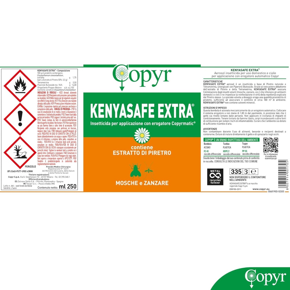 L’insetticida aerosol Kenyasafe Extra della Copyr vanta un’azione repellente straordinaria grazie all’elevata concentrazione di Piretro naturale che agisce sul sistema nervoso degli insetti, impedendo quindi possibili assuefazioni all’attivo. La bomboletta spray agevola l’impiego del prodotto: basta integrarlo all’interno di un diffusore automatico per risultare efficace contro tutti gli insetti volanti e in particolare contro zanzare e mosche.