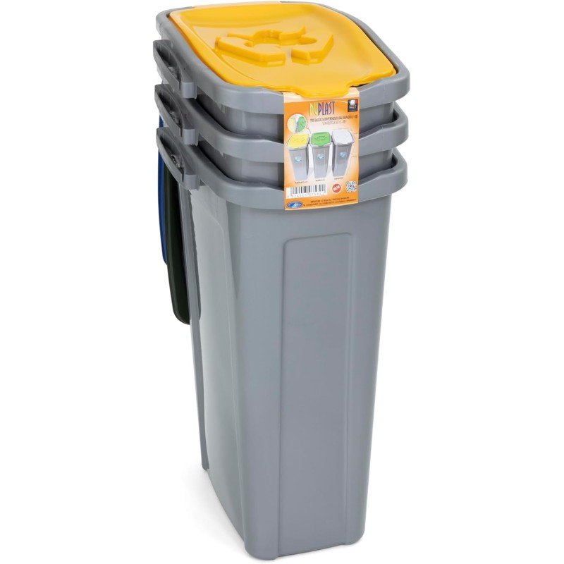 Set di 3 bidoni per la raccolta differenziata dal design compatto e funzionale, ideale per casa, ufficio o spazi ridotti. Realizzati in plastica resistente, sono progettati per essere affiancati o impilati, ottimizzando lo spazio senza rinunciare alla praticità. Le dimensioni compatte (circa 53 cm di altezza, 35 cm di profondità e 25 cm di larghezza) li rendono perfetti per essere inseriti in cucina, dispensa, balcone o sotto il piano di lavoro.