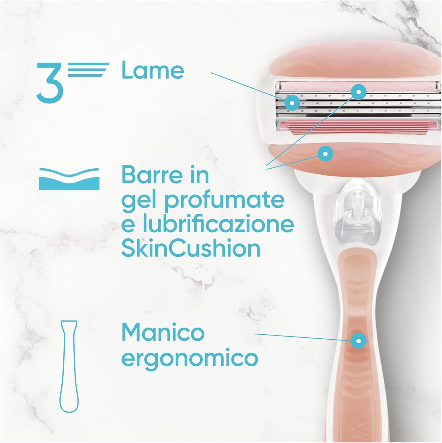 Le lame dei rasoi da donna Venus sono pensati appositamente per il corpo femminile. I rasoi da donna Venus Comfortglide Spa Breeze hanno 3 lame, per una rasatura fluida e profonda. Le lame di ricambio del rasoio sono dotate di barre con gel che rilasciano un burro per il corpo al profumo di tè bianco, per donare comfort e scorrevolezza. Con una struttura oscillante che si adatta ai contorni del tuo corpo Tutte le lame di ricambio Venus sono compatibili con un qualsiasi rasoio Venus (eccetto Simply Venus e Venus Pubic Hair And Skin).