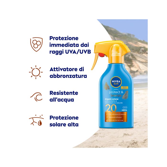 Nivea Sun Spray Solare Protect & Bronze FP20 è uno spray che contiene un estratto vegetale di pro-melanina, che attiva il naturale processo di abbronzatura della pelle. Il risultato è un'abbronzatura dorata, intensa e uniforme al 100% naturale, senza aggiunta di autoabbronzanti.