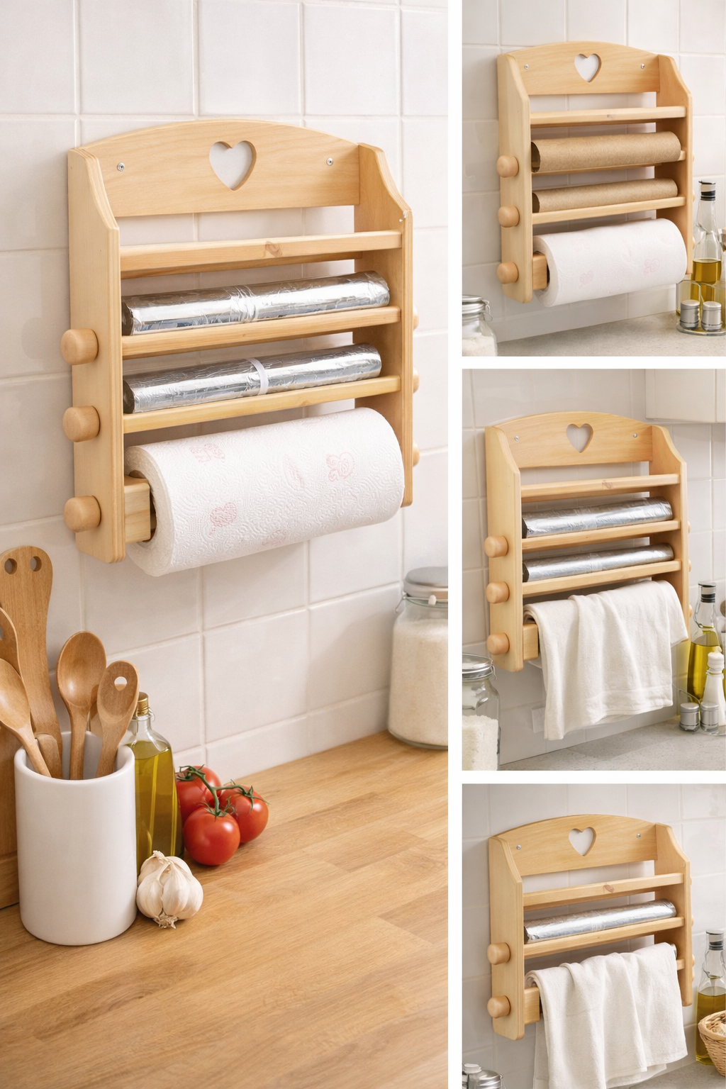 Funzionale e dal fascino rustico, questo porta rotoli da cucina in legno è la soluzione ideale per organizzare in modo pratico e ordinato i principali accessori da cucina. Realizzato in legno naturale con finitura calda, unisce solidità e stile tradizionale, adattandosi perfettamente a cucine classiche e country. La struttura è progettata per ospitare più rotoli contemporaneamente, come carta da cucina, carta forno, alluminio e pellicola trasparente, mantenendoli sempre a portata di mano. Il taglio a cuore sulla parte superiore aggiunge un tocco decorativo elegante e accogliente. Facile da fissare a parete, consente di risparmiare spazio sul piano di lavoro, migliorando l’organizzazione e la funzionalità della cucina.