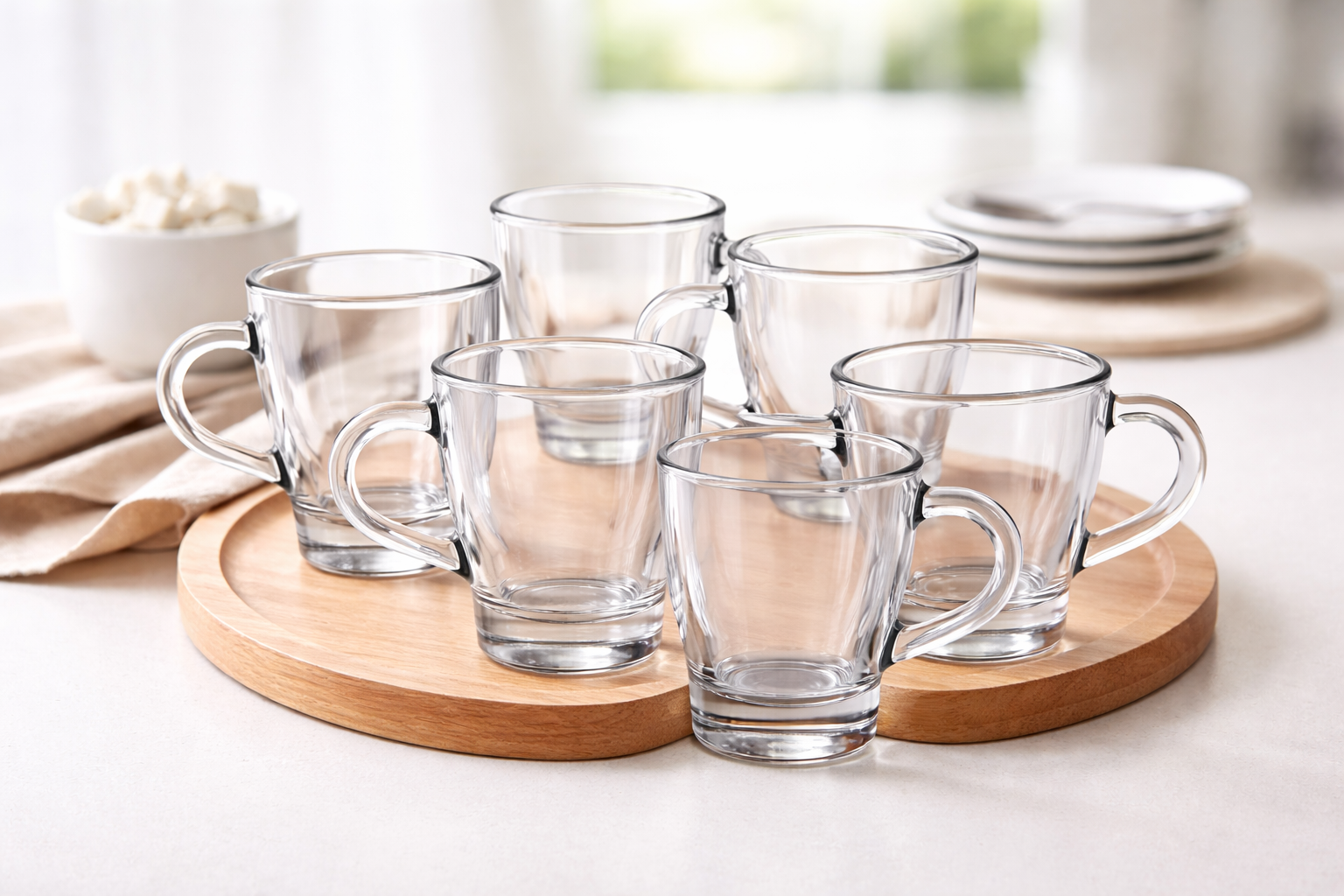Set composto da 6 tazzine in vetro trasparente, eleganti e resistenti, ideali per caffè, espresso, tè o bevande calde.