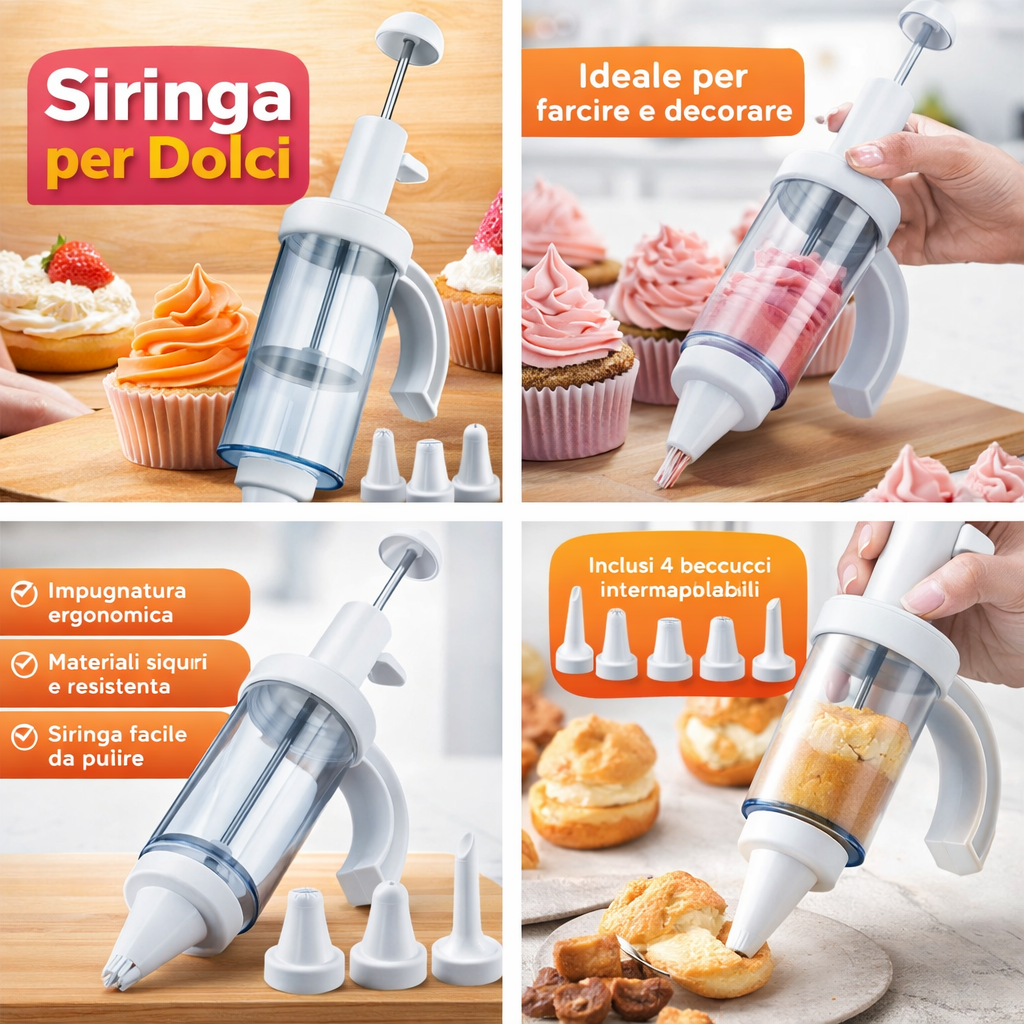 Rendi ogni dolce una piccola opera d’arte! Questa siringa per dolci è ideale per farcire e decorare torte, bignè, cupcake e biscotti in modo preciso e senza sprechi
