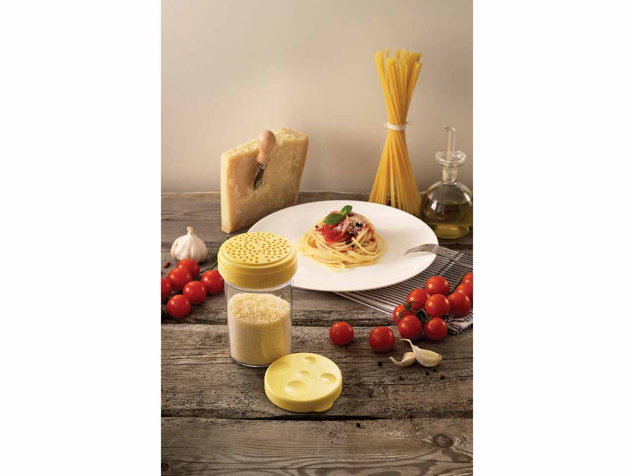 Contenitore per spargere il formaggio grattugiato direttamente sulle pietanze. Dotato di sistema interno brevettato per evitare la formazione di grumi. Dopo l’uso, con il coperchio ermetico diventa un pratico contenitore per conservare il formaggio in frigorifero