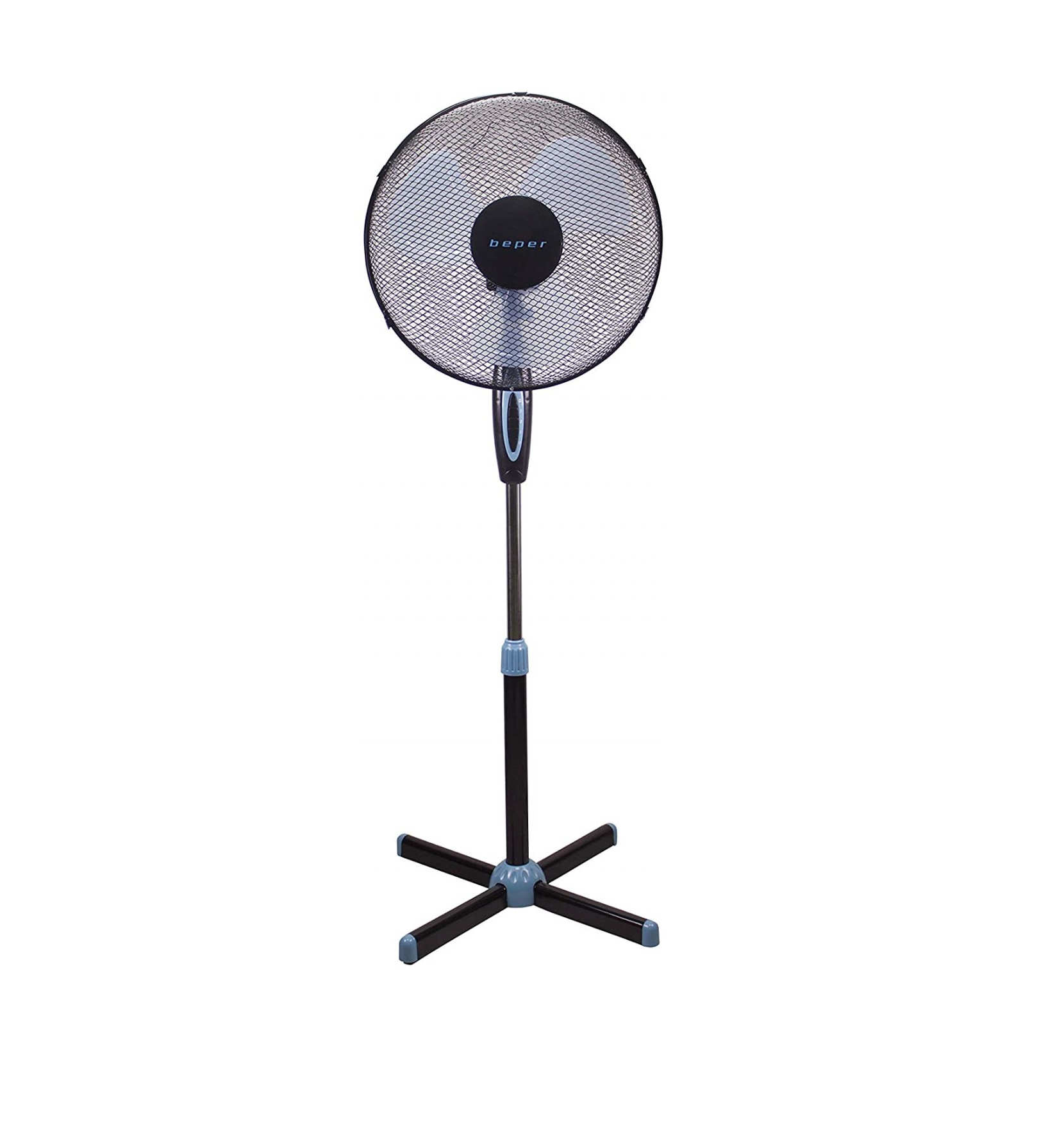 Ventilatore a piantana a 3 pale trasparenti con griglia di protezione in acciaio dal diametro di 40 cm. È possibile impostare tre velocità, con luce di funzionamento quando è in azione. Altezza regolabile fino a 130 cm. Completo di oscillazione automatica e inclinazione regolabile. Motore da 35W e base a croce