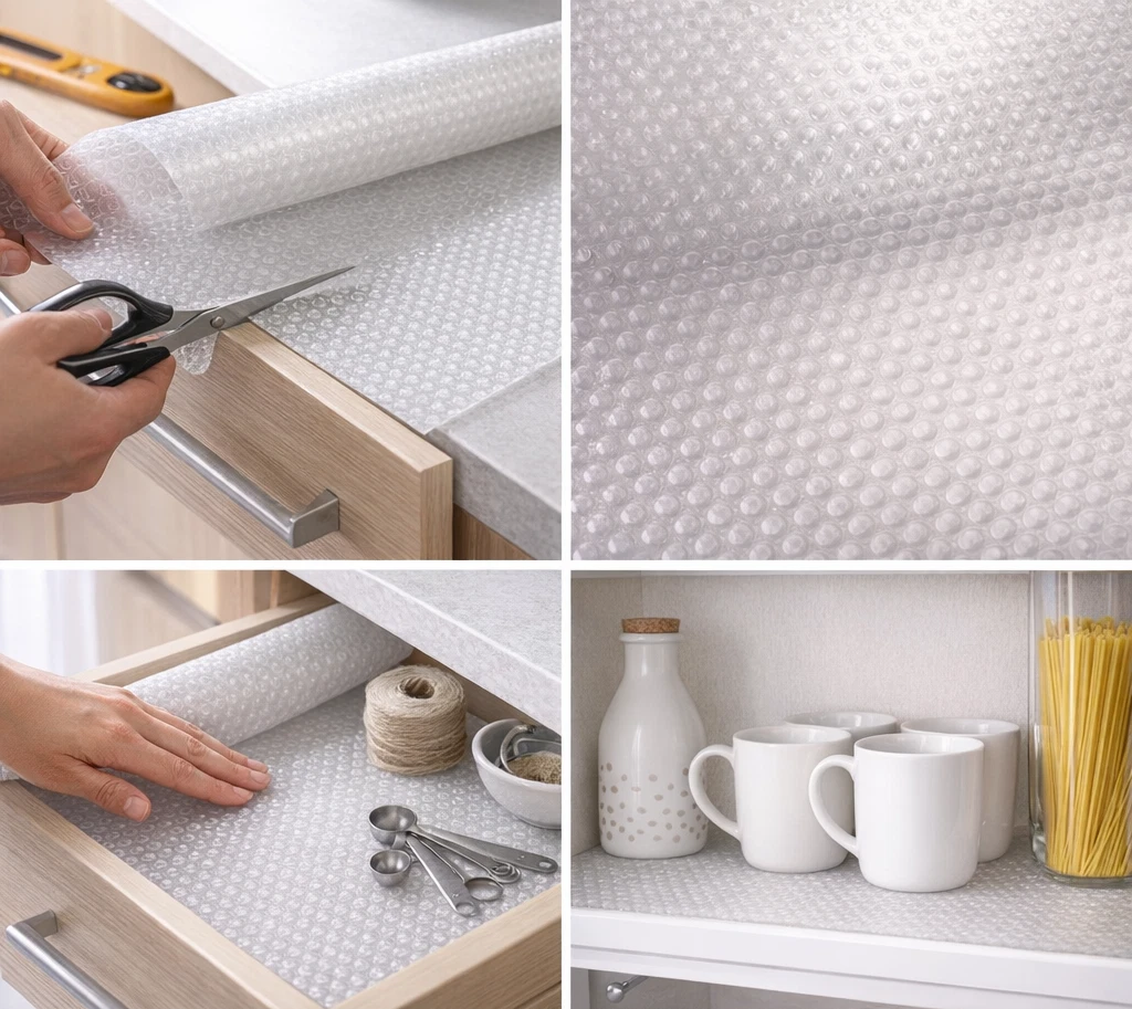 Proteggi e organizza i tuoi spazi con il rotolo multiuso protettivo ideale per cassetti, ripiani e superfici della cucina. Realizzato in materiale plastico resistente con struttura a bolle, offre un’eccellente protezione contro graffi, urti e scivolamenti, mantenendo mobili e superfici sempre in perfette condizioni.