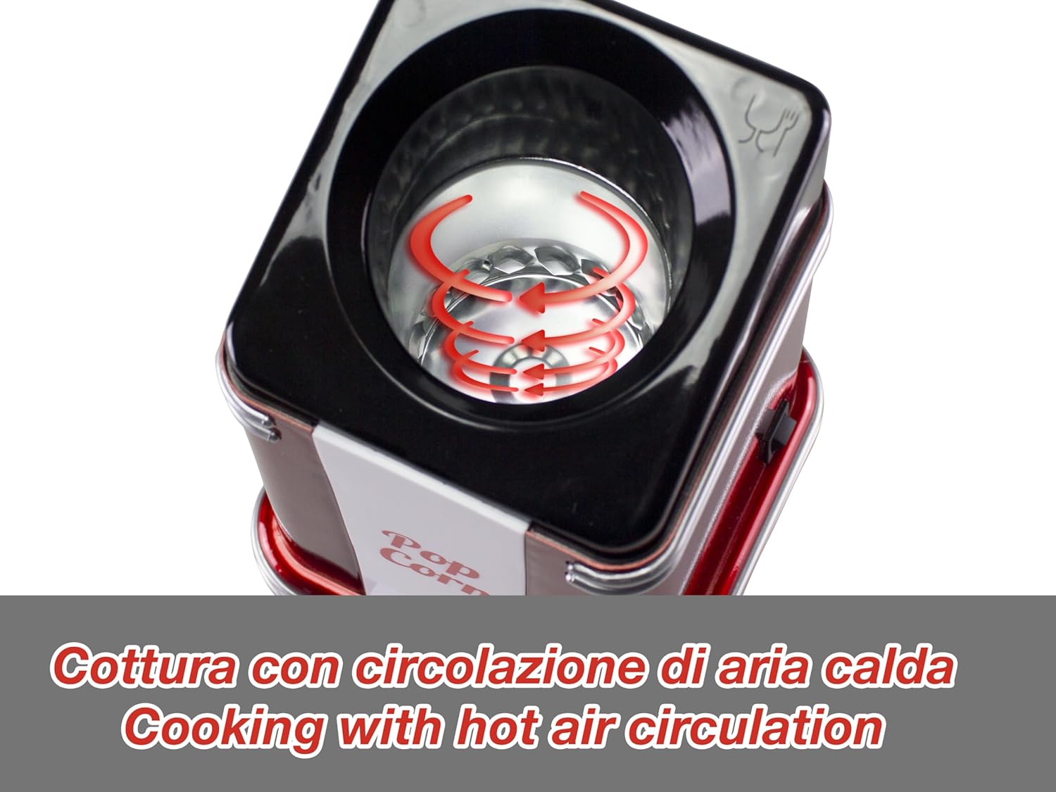 CIRCOLAZIONE DI ARIA CALDA: Grazie all'avanzato sistema ad aria calda i chicchi di mais verranno uniformemente riscaldati e i popcorn scoppieranno rapidamente senza l'aggiunta di grassi; spina tedesca.