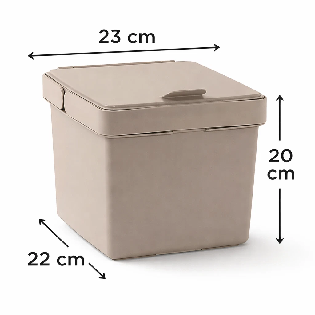 Le dimensioni compatte (23 × 22 × 20 cm) la rendono perfetta da posizionare sul piano cucina, sotto il lavello o in piccoli spazi, senza ingombrare. Il coperchio richiudibile aiuta a contenere odori e a proteggere l’ambiente da insetti, garantendo massima igiene.