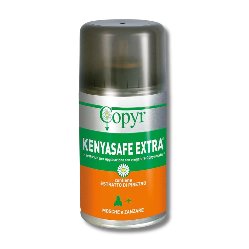 L’insetticida aerosol Kenyasafe Extra della Copyr vanta un’azione repellente straordinaria grazie all’elevata concentrazione di Piretro naturale che agisce sul sistema nervoso degli insetti, impedendo quindi possibili assuefazioni all’attivo. La bomboletta spray agevola l’impiego del prodotto: basta integrarlo all’interno di un diffusore automatico per risultare efficace contro tutti gli insetti volanti e in particolare contro zanzare e mosche.