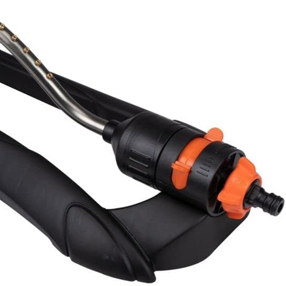 19 fori di spruzzo: collegate l'irrigatore al tubo da giardino, lo accendete e l'irrigatore si muove avanti e indietro con un movimento oscillante.
