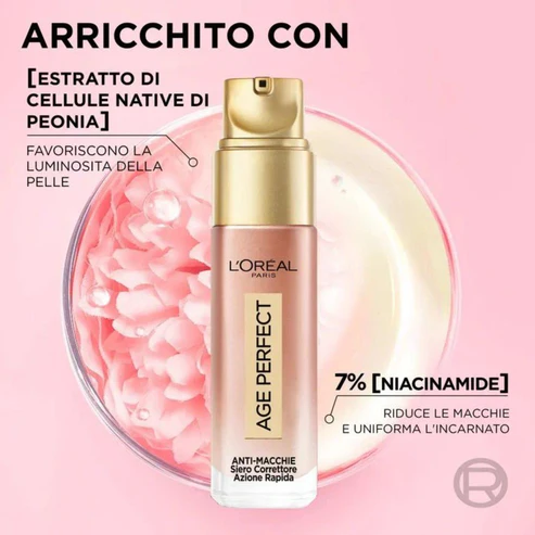Nuovo siero Correttore Azione Rapida Anti-Macchie di L'Oréal Paris per pelli mature con cellule native di peonia e Niacinamide. Corregge rapidamente la visibilità delle macchie. Dopo i 60 anni, i cambiamenti della pelle possono influire sulla sua naturale luminosità e struttura, causando una pelle spenta e atonica. Ravviva lo splendore della tua pelle con il nuovo Siero Correttore Azione Rapida Anti-Macchie di L'Oréal Paris. - Cellule native di peonia: il siero è formulato con una tecnologia esclusiva fino al 2032. La gamma Age Perfect è formulata con Cellule native di Peonia, un esclusivo e innovativo estratto concentrato in antiossidanti, sviluppato attraverso un processo di biotecnologia brevettato da L'Oréal. Le cellule native di peonia sono all'origine del colore rosato delle peonie. Se incluse in un trattamento, hanno il potere di favorire la luminosità della pelle con un glow rosato, oltre a contrastare i segni dell'invecchiamento, tra cui le macchie dell'età e il tono non uniforme.