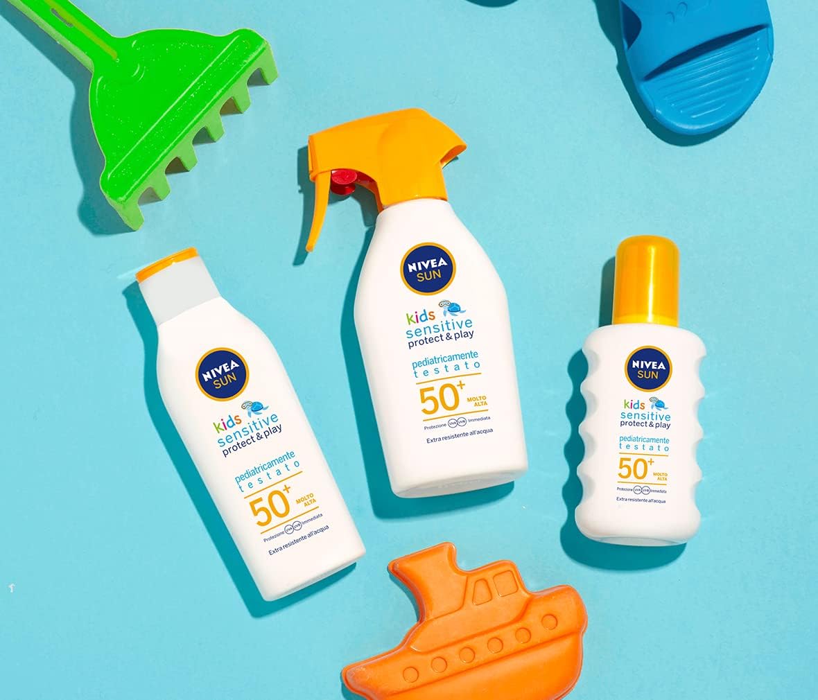 La protezione solare 5in1 per la pelle sensibile di bambini e ragazzi. Extra resistente all'acqua, protezione immediata dai raggi UVA/UVB. NIVEA Sun Babies & Kids Sensitive Protect Spray.