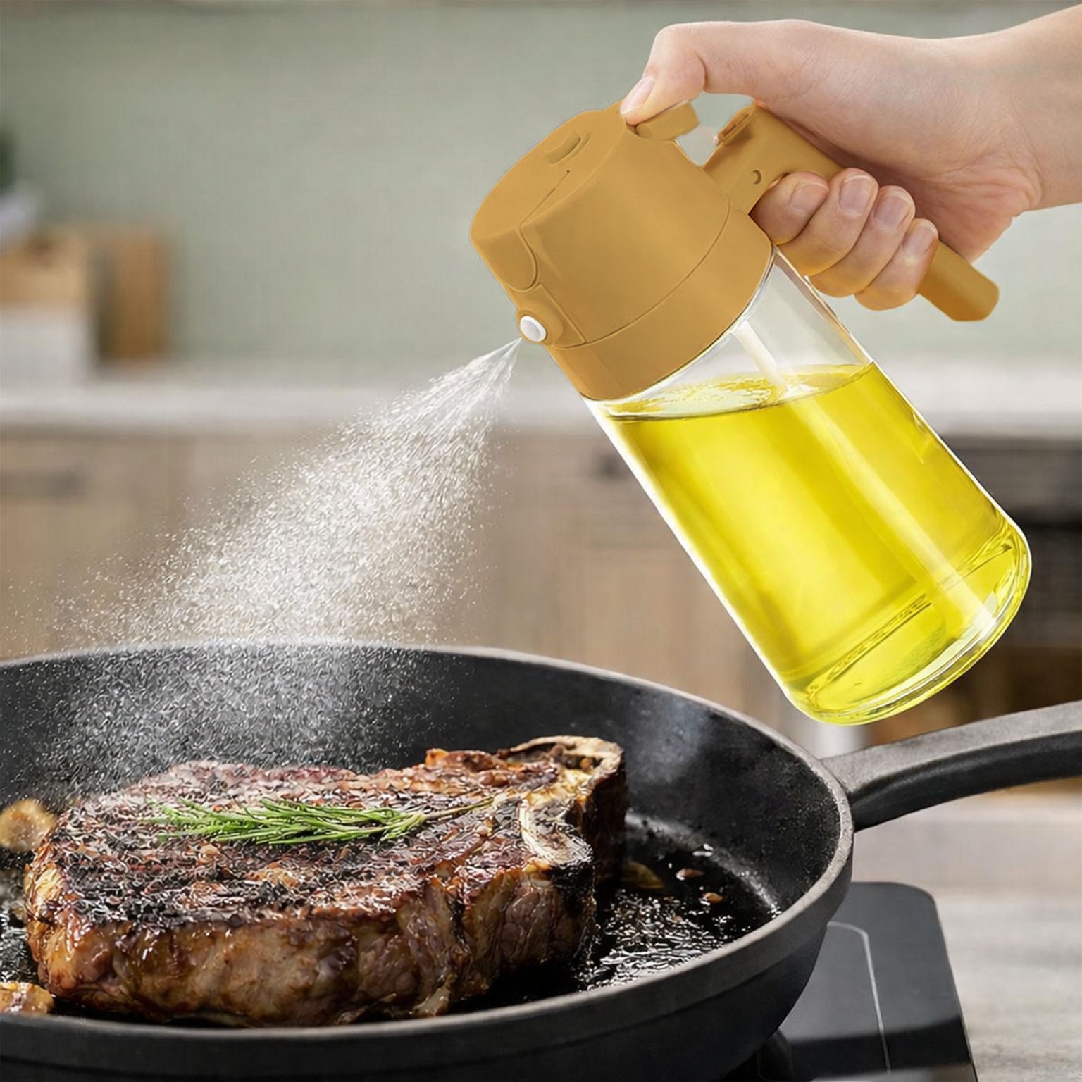 Dispenser olio spray dal design moderno e funzionale, realizzato in cristallo trasparente.