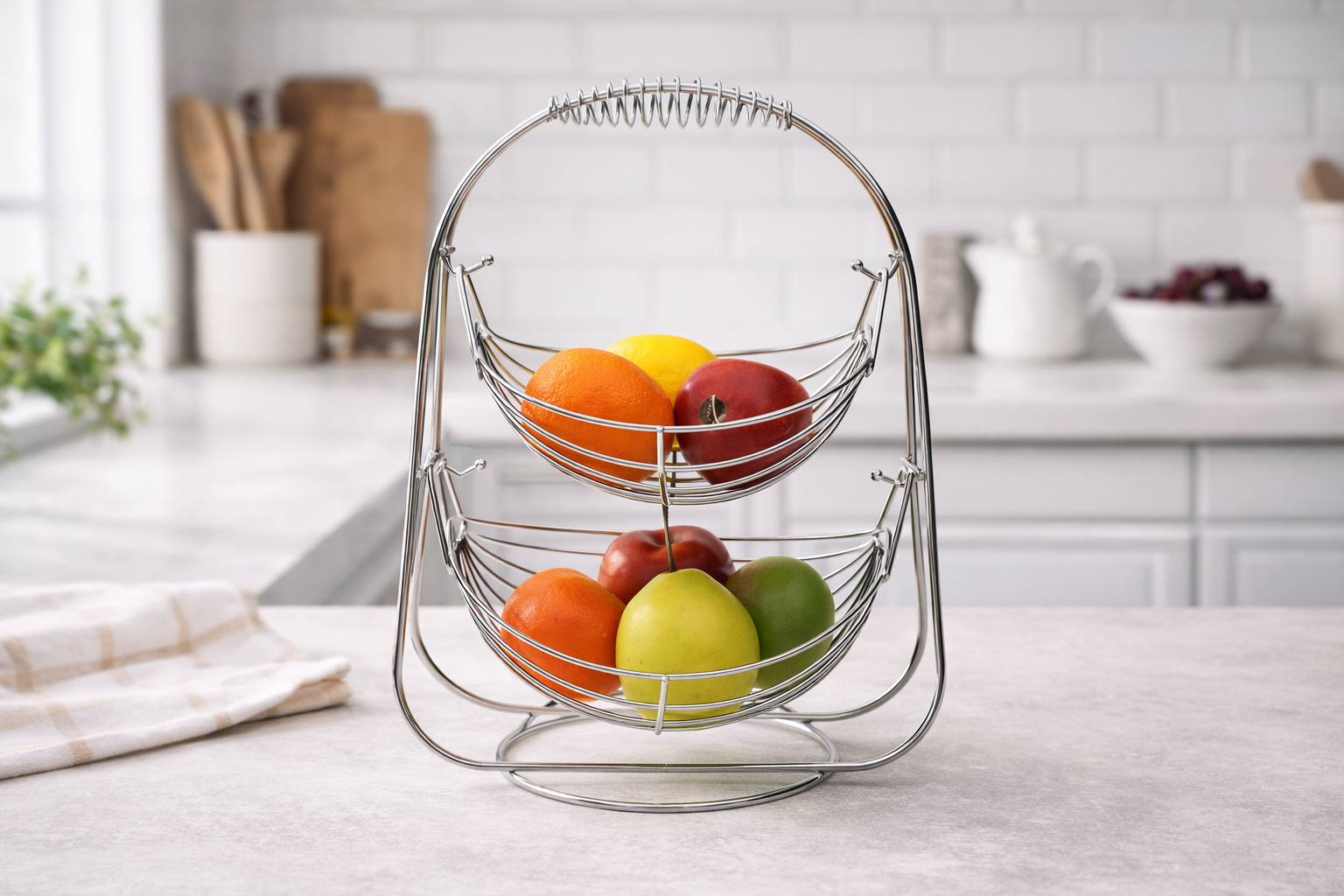 Porta frutta in metallo cromato a due piani cm.41h