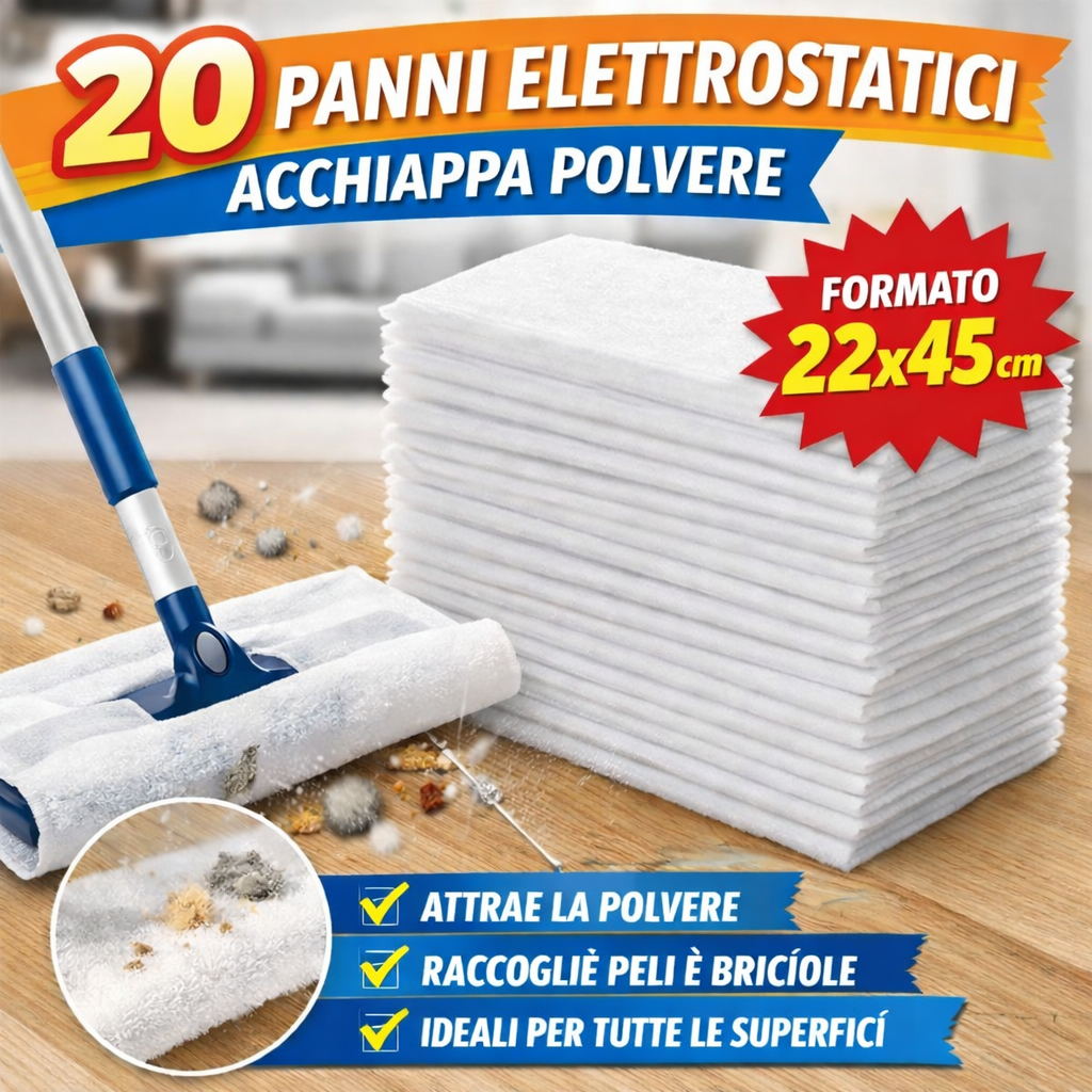 Mantieni la tua casa pulita in modo rapido ed efficace con i panni elettrostatici acchiappa polvere. Grazie alla speciale struttura elettrostatica, questi panni attirano e trattengono polvere, peli e piccoli detriti senza disperderli nell’aria.Il formato grande 22x45 cm garantisce una copertura ampia e una pulizia più veloce, riducendo il numero di passaggi. Perfetti per pavimenti, parquet, piastrelle, laminati e superfici lisce.