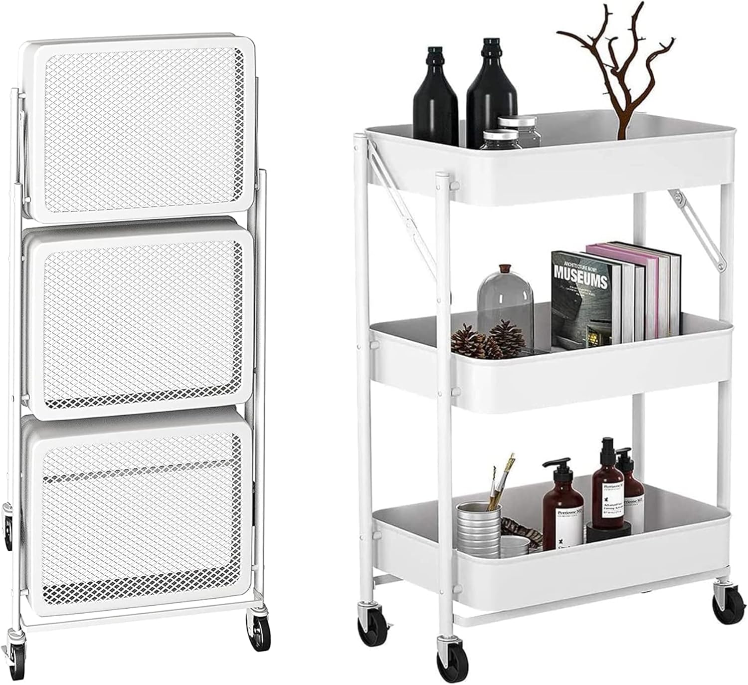 Carrello multiuso pieghevole in metallo bianco con 3 cestini e ruote cm.45x29,5x77h