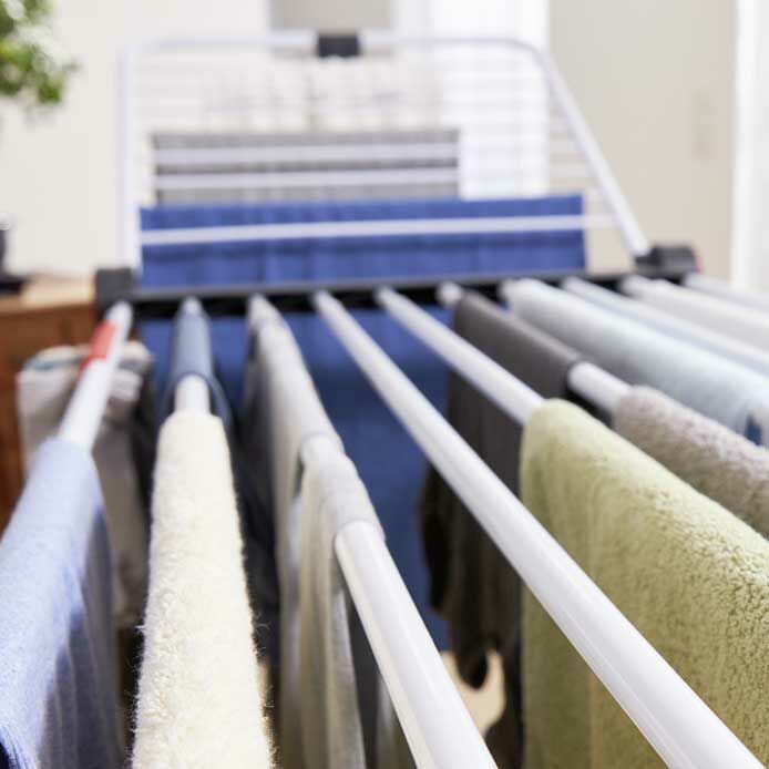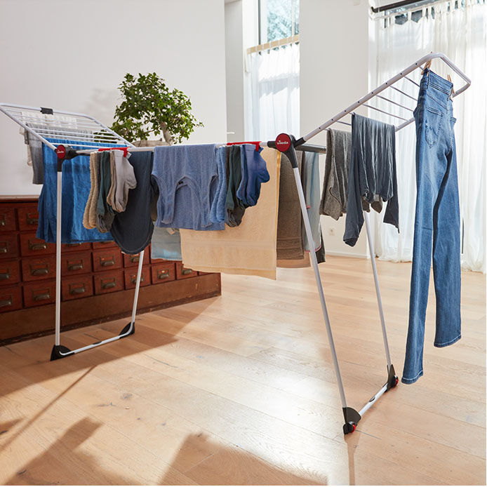 Lo stendibiancheria di grandi dimensioni è dotato di due pratiche ruote che permettono di spostarlo anche quando carico, dove si preferisce, dentro o fuori casa. Dopo l’uso, Vileda Infinity Flex Plus è semplice da chiudere e riporre in sicurezza, grazie al blocco ali che impedisce eventuali aperture accidentali.