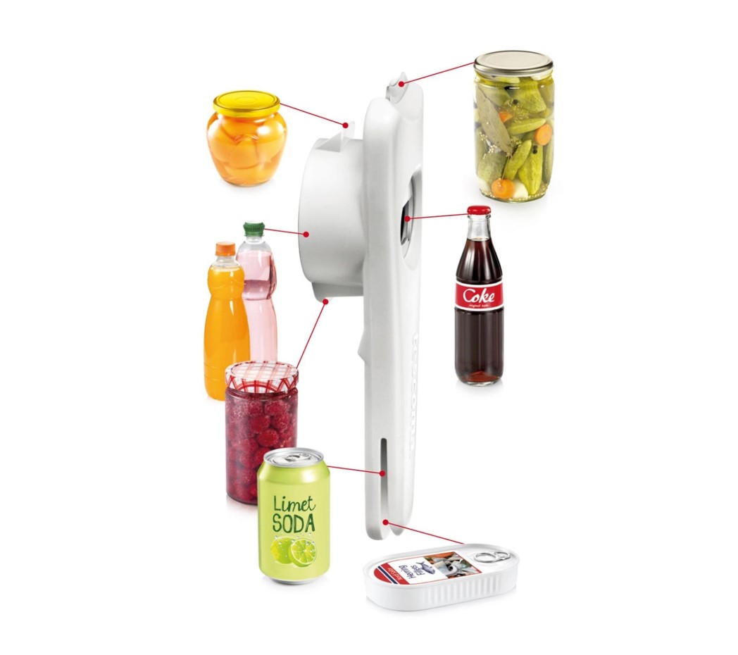 Ideale per aprire senza fatica bottiglie con tappo a capsula, bottiglie in PET, scatolette e lattine con apertura a linguetta, barattoli con coperchio a vite e coperchi piatti.