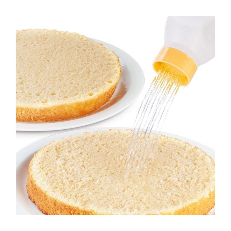Il corpo dellabottiglia è flessibile ed è provvisto di una scala graduata mentre il tappo a doccetta è perfetto per bagnare in modo uniforme la base della torta in pan di spagna