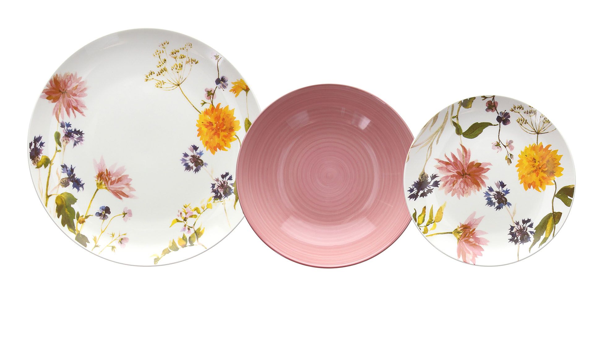 Questo servizio gioca con il color rosa nel piatto fondo ed elementi decorati a motivi floreali nel piatto piano e dessert, creando un mood in tavola decisamente romantico, fresco e giovane.